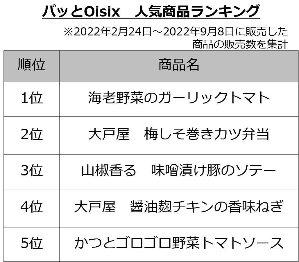 パッとOisix人気商品ランキング上位の商品では、”ガーリックトマト“といった洋風の炒め物や”醤油麹“など、ご自宅にある調味料では再現しにくい味付けが人気です。また、ご家庭で一から作ると時間のかかる、海老の下処理、肉の漬け込み、かつを揚げるといった調理工程がなく、短時間で出来上がる点も支持を得ています。