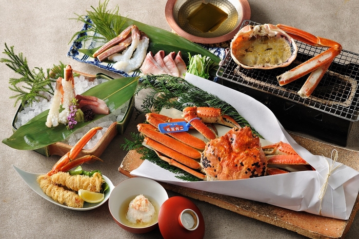 夕食は、プライベート感が保てる半個室のある食事処で、島根や出雲の食文化を堪能できる会席料理を提供します。11 月上旬には松葉蟹漁解禁シーズンになり、松葉蟹を会席料理で堪能できる、特別会席「タグ付き活松葉蟹会席」の提供がスタート。メインの台の物は、2施設で異なる調理法を用いて提供します。「タグ付きの活蟹」を、すみからすみまで一杯まるごと味わい尽くせます。