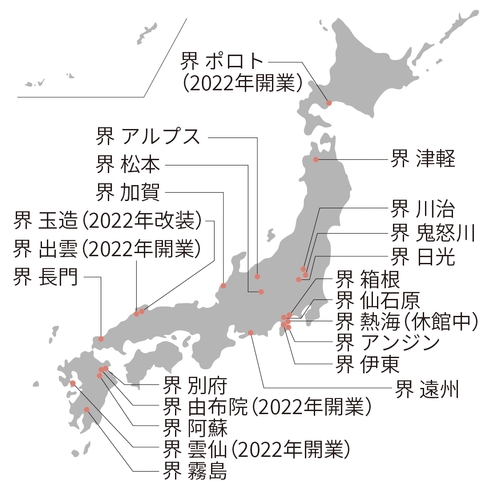 「界」は星野リゾートが全国に展開する温泉旅館ブランドです。「王道なのに、あたらしい。」をテーマに、季節の移ろいや和の趣、伝統を生かしながら現代のニーズに合わせたおもてなしを追求しています。また、その地域の伝統文化や工芸を体験する「ご当地(とうち)楽(がく)」や、地域の文化に触れる客室「ご当地部屋」が特徴です。現在、全国各地に展開しており、2022 年 11 月には、「界 玉造」が島根県・玉造温泉にて改装をへて再開業、「界 出雲」が同県・出雲ひのみさき温泉に、「界 雲仙」が長崎県・雲仙温泉に新規開業します。