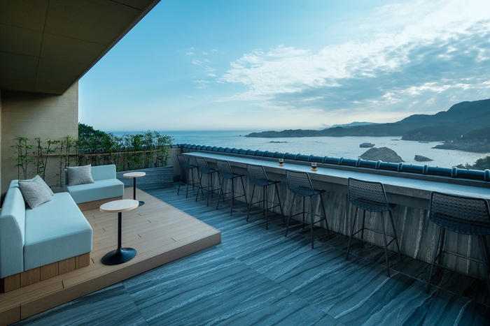 トラベルライブラリーに併設した、海を望む場所にテラスを設けています。ゆっくりと腰かけ、明け方、かわたれ時の朝日に染まる景色を満喫できます。