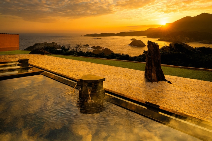 界 出雲の全5タイプの客室すべてがご当地部屋「彩海の間」。客室からは、刻々と表情を変えていく空や海の景色を楽しめるため、その様子を「彩海」と表現しました。また、界 出雲から最も近い神社である日御碕神社の下の宮は、「日沉宮(ひしずみのみや)」と呼ばれ、天照大御神が祀られています。伊勢神宮が「日の本の昼を守る」ことに対し、日御碕神社は「日の本の夜を守る」と言われています(*1)。その言い伝え通り、このエリアでは、夕日が沈む時から夜が明けるまでの景色の移り変わりを堪能できます。日御碕灯台を望む客室からは夕日に赤く染まる情景を、出雲松島を望む客室からは朝焼けに包まれる景色など、全39室の客室、それぞれ異なる海の彩りを感じることができます。