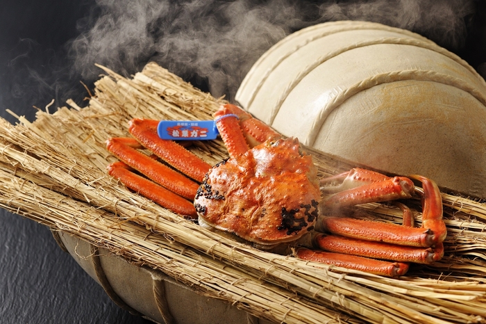 メイン料理は、松葉蟹を稲わらで包んで蒸しあげた「活蟹の豊年蒸し」。出雲大社にゆかりのある五穀豊穣の神様、大国主(おおくにぬしの)命(みこと)からヒントを得た蒸し蟹料理です。稲わらで包み、俵型の器で提供します。稲わらで包んだまま蒸し上げているため、味に豊かさが増します。ほんのりと香るわらの香りとともに堪能できる一品です。