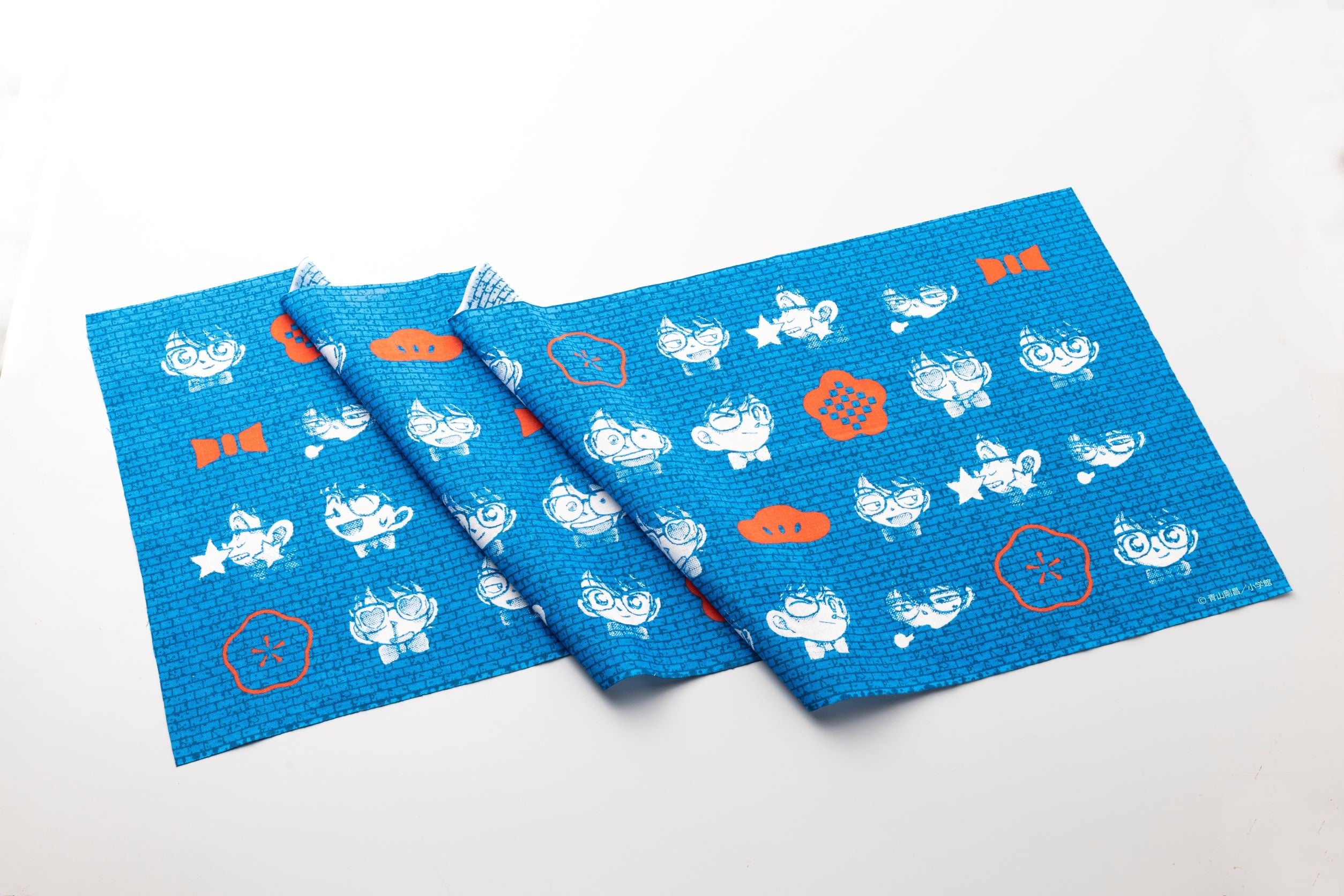 コミックスの背表紙イラストでおなじみの、コナンのミニイラストをデザインした手ぬぐい、鮮やかな藍色に白抜きのコナンと赤い蝶ネクタイや松竹梅のモチーフが生えるデザインです。お重をのせるテーブルランナーや手ぬぐいとしてもご使用いただけます。
