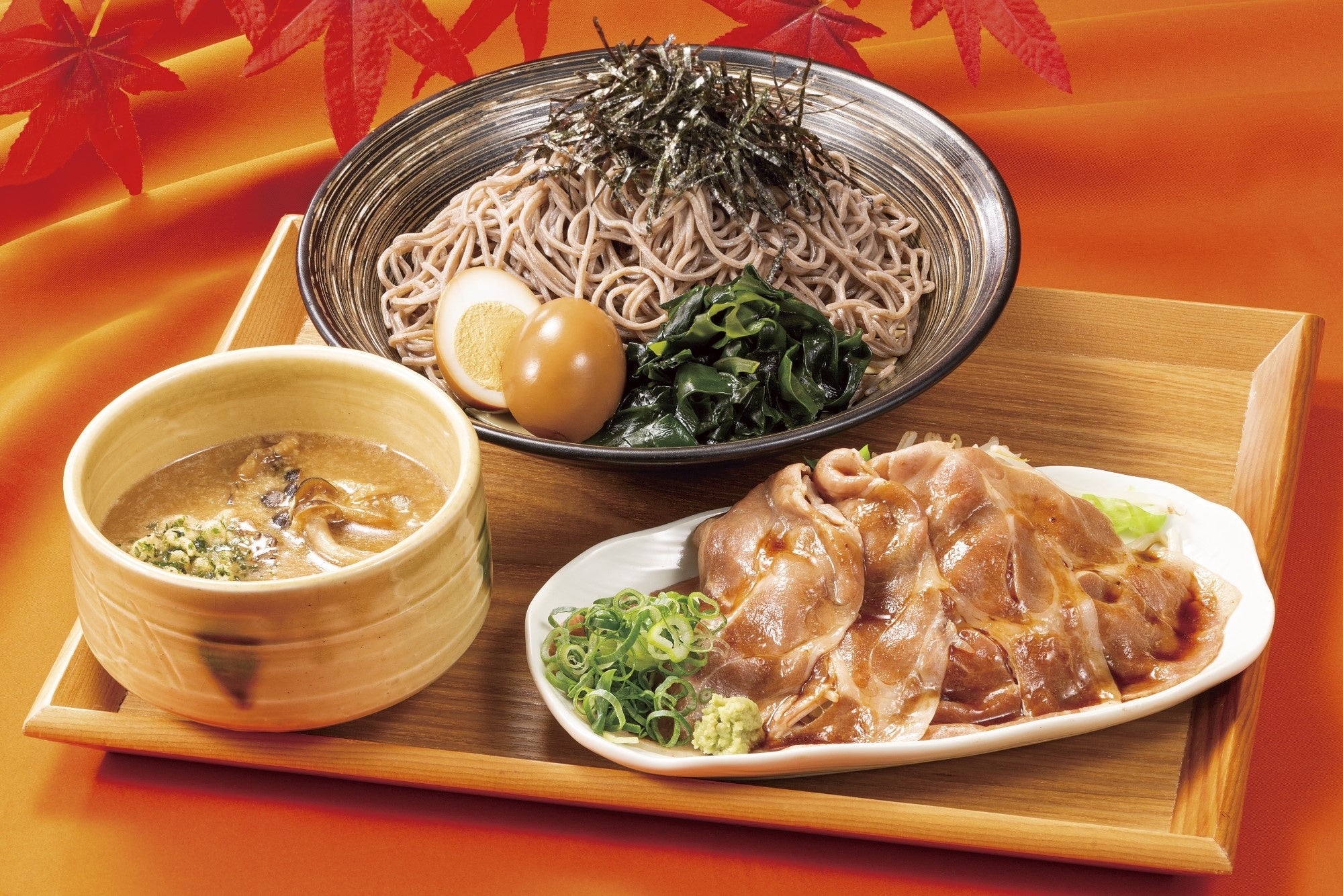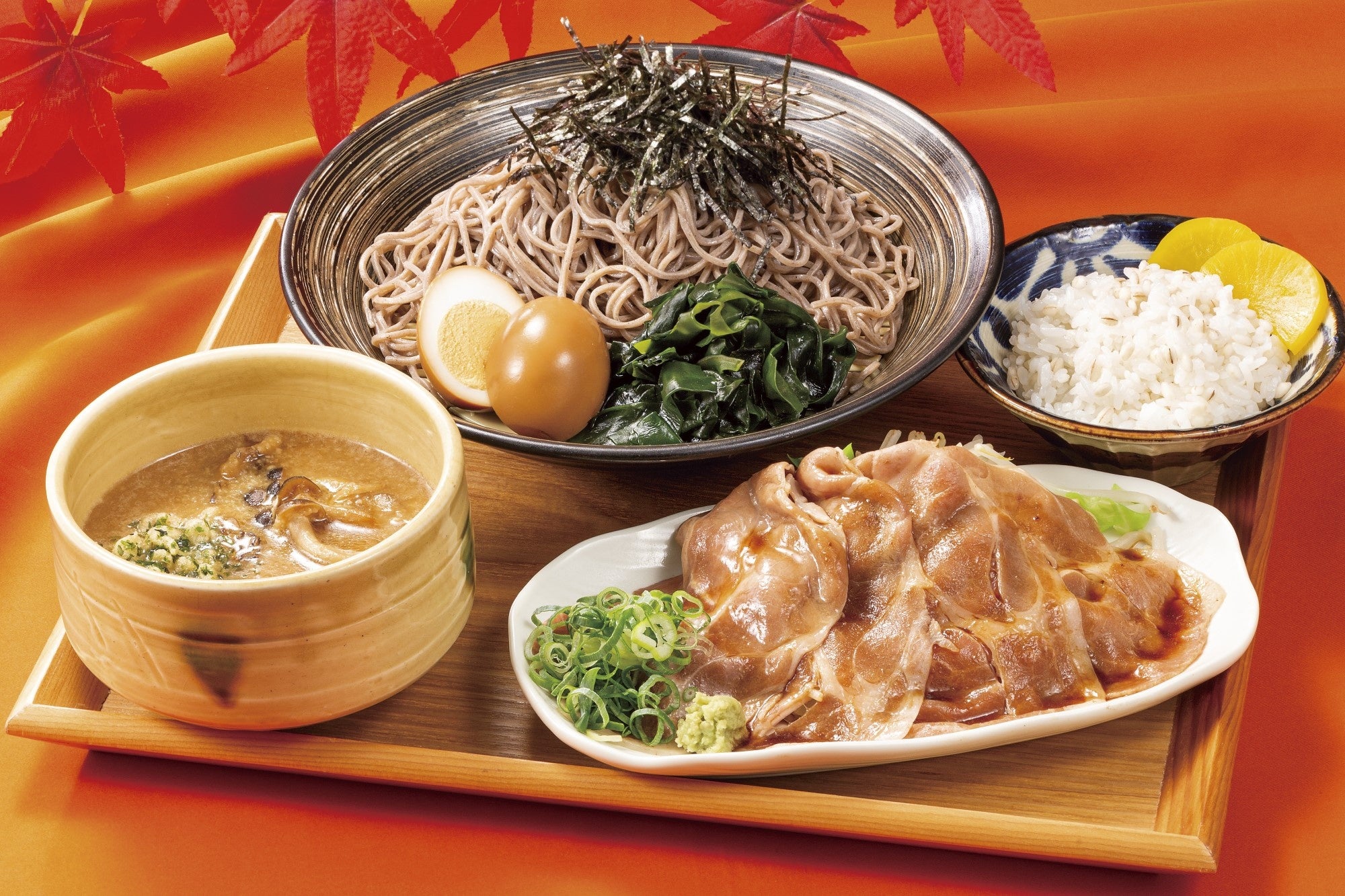舞茸としめじを、自家製のそばつゆとすりおろしたとろろで仕立てた温かい”きのことろろ汁”は、青のりをまぶしたあげ玉で甘口に。醤油ベースで甘さ際立つタレをまとった豚すきとそばを”きのことろろ汁”にからめれば、ひとくちで食欲の秋を楽しめるあったかメニューです。