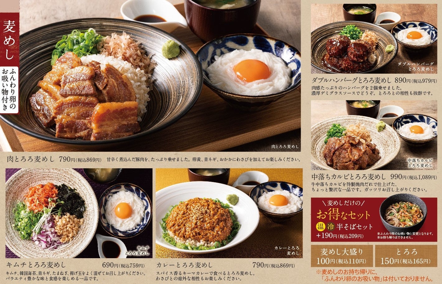 「きのことろろ汁と肉すきそば」は、そば大盛りでご用意しておりますが、もっとたくさん食べてお腹いっぱいになりたいというご要望にもお応えする「追い麦めしセット」は、+100円(税込110円)でご注文いただけます。