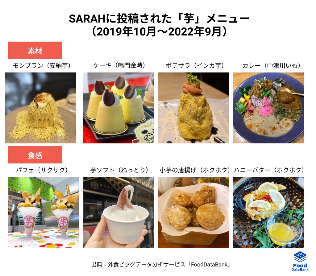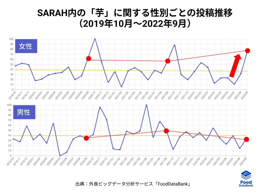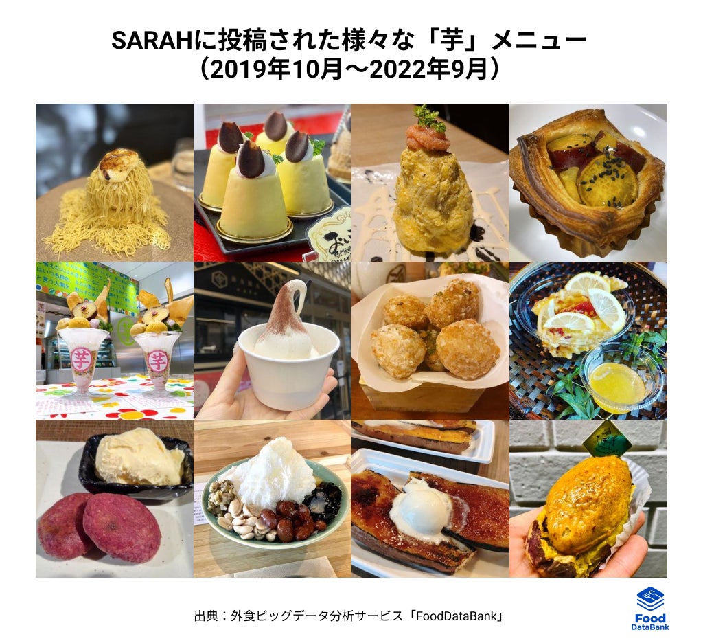 累計90万件以上のおいしい一皿が集まるグルメコミュニティサービス「SARAH」を運営する、株式会社SARAH(本社:東京・千代田、代表取締役:髙橋洋太)は、「外食トレンドニュース2022年10月号」を公開いたしました。ユーザーの投稿情報を外食ビッグデータ分析サービス「FoodDataBank」で分析したところ、毎年秋ごろに伸長する芋人気は主に女性が牽引し、今年は例年に比べて前倒しで人気の傾向があることが分かりました。今回は「芋」について、どのようなメニューが選ばれているのか、その注目ポイントを掘り下げてお伝えします。