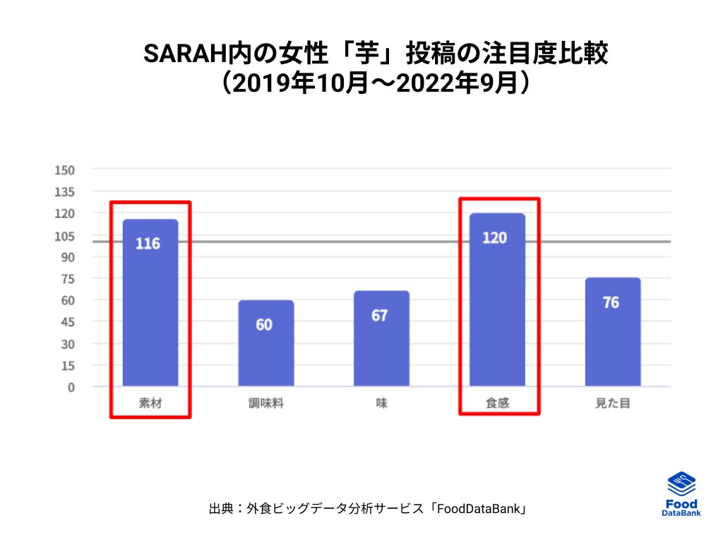 女性の「芋」投稿に関する注目度比較をみてみると、「素材」と「食感」がポイントであることが分かります。