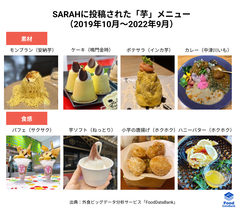 SARAH内に投稿された「芋」メニューをみると、「安納芋」や「鳴門金時」といった素材(品種)が明記されているメニューが多く見受けられました。また、パフェに揚げた「サクサク」のさつまいもをトッピングして食感に変化をもたせたり、ソフトクリームに芋ならではの「ねっとり」とした食感を活かしたりと、様々な角度から「芋」を感じることができるメニューが人気のようです。