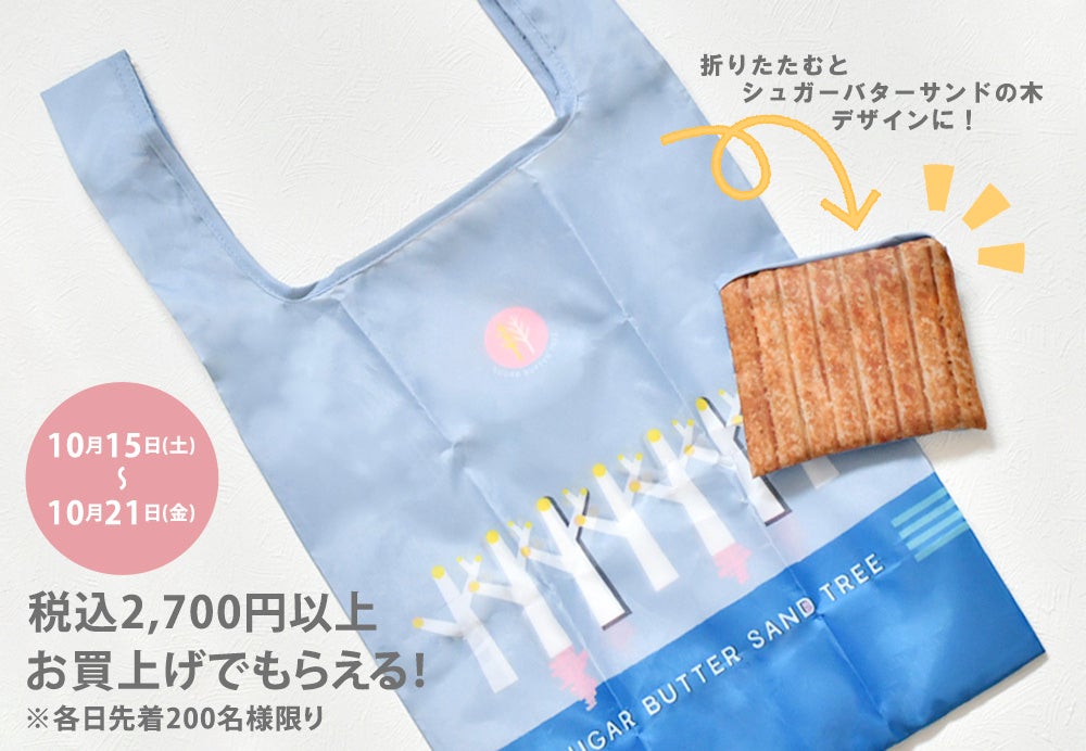 またまたうれしいお知らせ。リニューアルOPENの10月15日(土)~21日(金)の期間中、シュガーバターの木 阪急うめだ店にて税込2,700円以上お買上げいただいたお客様に「シュガーバターの木 オリジナルデザインエコバッグ」をおひとつプレゼント。シュガーバターサンドの木の包装紙をイメージしたオリジナルデザインです。折り畳むとサクサクおいしそうなシュガーバターサンドの木のデザインに!各日先着200名様限定なのでお見逃しなく。