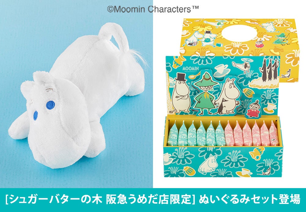 シュガーバターの木 阪急うめだ店のリニューアルオープンはお楽しみが盛りだくさん。「ムーミン シュガーバターの木 詰合せ 12個入」と可愛すぎるムーミンのぬいぐるみが付いたセットが、阪急うめだ店限定で登場します!ころんと寝転んで そっと首をかしげる姿は『ムーミン×シュガーバターの木』コラボだけのオリジナルポーズです。ふわモチのさわり心地と、あなたを見つめるキュートな瞳に癒されちゃう。ふさふさのしっぽがチャームポイントです。そんな ぬいぐるみになったムーミンを、シュガーバターの木と一緒にぜひおうちに迎えてあげて。