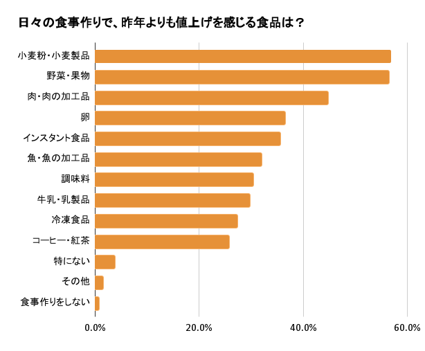 当社が本年7月に食品宅配を利用するお子様がいるご家庭を対象に実施したアンケート※によると、日々の食事作りをする中で、小麦粉や小麦製品(パン・パスタ)、青果、肉・肉加工品では半数以上の方が値上げの影響を実感していることが分かりました。また、4月以降「お米を食べる頻度」が増えているという回答は全体の7割を超え、価格が据え置かれているお米に主食をスイッチすることで食費を抑えようという動きが顕著になっています。