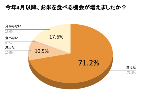 小麦を中心に食品価格の高騰が相次ぐ中、当社が実施したアンケートでは「今年4月以降お米を食べる機会が増えた」という回答が7割を超える結果となっており、価格が据え置かれているお米回帰が進んでいます。