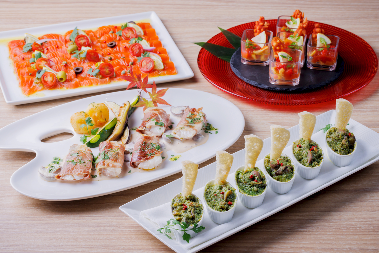 三陸産の魚介が華麗な洋食に変身。「翡翠アワビと三陸産帆立の肝バター ブルギニヨン」「銀王のマリネ 燻製オリーブオイル風味」「三陸産ホヤ ガスパチョ風ジュレ」「さくら真鯛のサルティンボッカ」などが並ぶ。