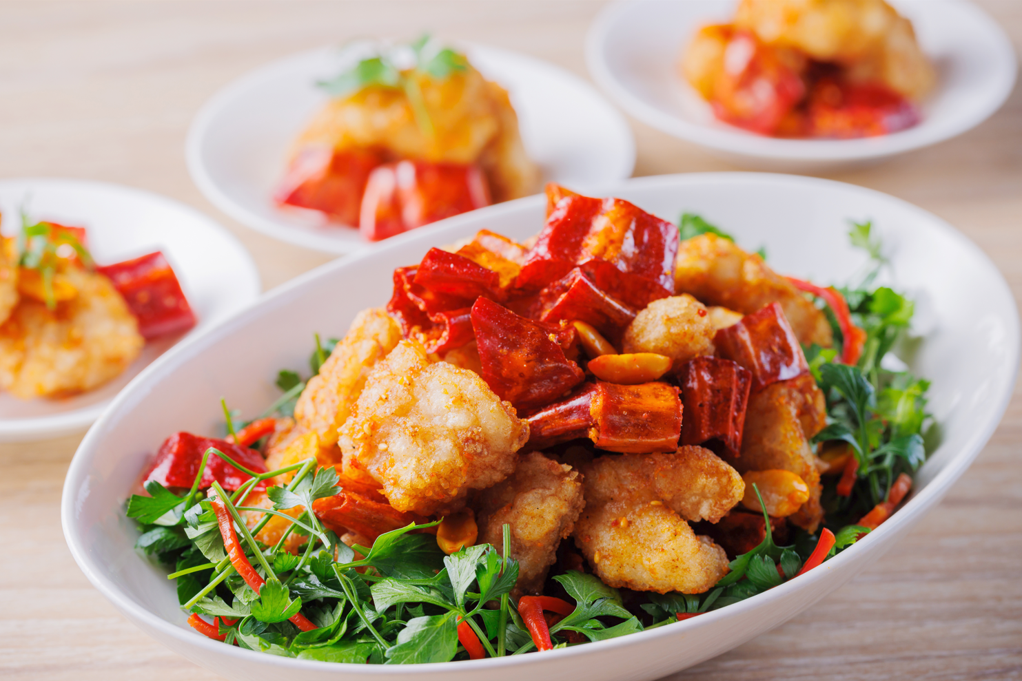 脂のりが良く、プリプリとした食感が魅力のアンコウを使用した一品「アンコウのクリスピーチリ」。程よい辛さで子どもから大人までスナック感覚で楽しめる。