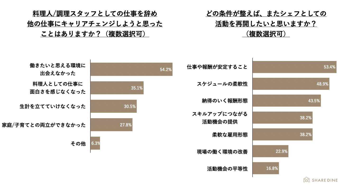 理由の1位が「働きたいと思える環境に出会えなかった」(54.2%)、2位「料理人としての仕事に面白さを感じなくなった」(35.1%)、3位 「生計を立てていけなくなった」(30.5%)が続きました。シェフの活動を再開するための条件を聞いたところ、「仕事や報酬が安定すること」が最も多い回答となり、「スケジュールの柔軟性」が続きました。