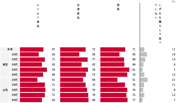 加工食品3種の利用状況について、全体ではレトルト食品は67%、冷凍食品は72%、惣菜は71%が利用していると回答した。性年代別にみると、20代の男性・女性ともに低い結果となった。