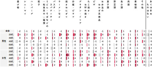 レトルト食品では「シチュー」「丼もの類の素」が高く、特に「シチュー」は女性50代以上で需要が期待されることがうかがえる。冷凍食品では「焼きおにぎり」「ピザ」「果物類」が高い。性年代別でみると、男性20代は「ラーメン」「焼きおにぎり」「炒飯・ピラフ」「たこ焼き・お好み焼き」「ピザ」など主食系の需要が高い。惣菜では男性20代、女性30代・50代で、幅広い品目において需要が高く、市場の期待性があると考えられる。