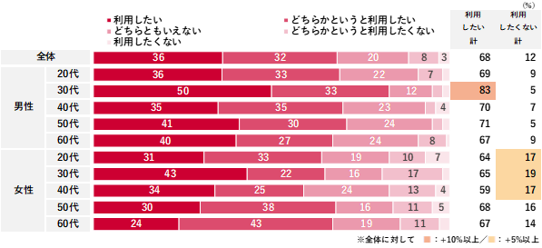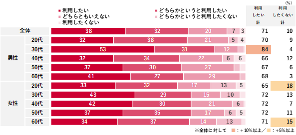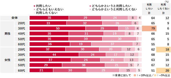 また、今後の利用意向について、レトルト食品は64%、冷凍食品は71%、惣菜は68%が利用したいと回答した。性年代別にみると、いずれの食品も男性30代で利用意向が80%前後と高かった。