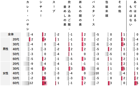 レトルト食品、冷凍食品、惣菜の品目ごとに、需要の見込まれる性年代が異なる