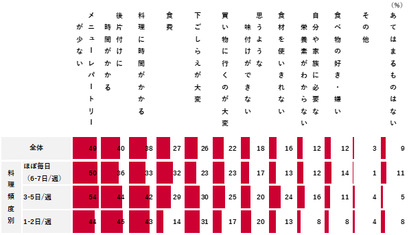 料理に関する悩みでは、全体で「メニューレパートリーが少ない」が49%で最も高く、次いで「後片付けに時間がかかる(40%)」、「料理に時間がかかる(38%)」と続く。料理頻度別でも上位3つの項目に変化はみられなかった。