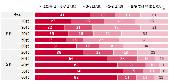 料理頻度は全体で「ほぼ毎日」が41%で最多となった。性年代別でみると、男性に比べて女性の方が「ほぼ毎日」が多かった。女性40代以上では「ほぼ毎日」が60%以上となった一方、男性40代以上は「自宅では料理しない」が最も高い結果となった。