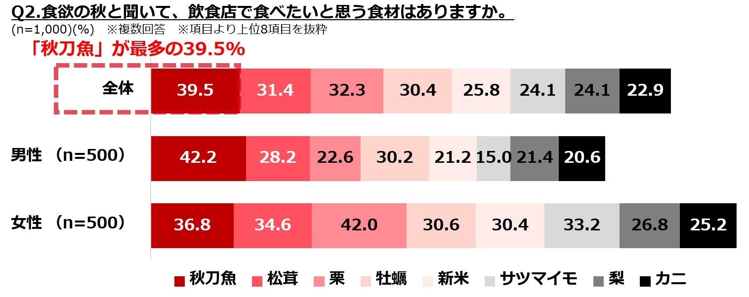 「食欲の秋」に外食したい食材を尋ねたところ、本レポートで取り上げた回答上位の食材では「秋刀魚」以外の全ての食材で女性の回答比率が高く、「食欲の秋」の盛り上がりは男女で差があることがうかがえる結果となりました。