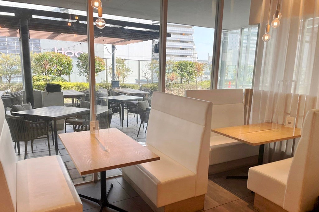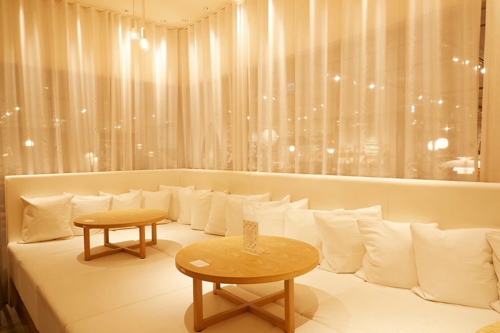 白を基調としながら、ナチュラルな木目も生かした店内には、柔らかなマットレスとクッションを敷き詰めた特徴的な小上がり席や、広々としたテーブル席を設え、ガーデンテラスから差し込む柔らかな光と緑が、より一層リラックスできる空間を演出しています。