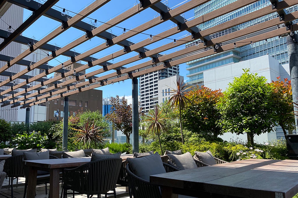 日本一高いビルとして知られる「あべのハルカス」など、立ち並ぶ高層ビルの間で、ぽっかりと広がる❝都会のオアシス空間❞、それが「和カフェ yusoshi あべの」のガーデンテラス。