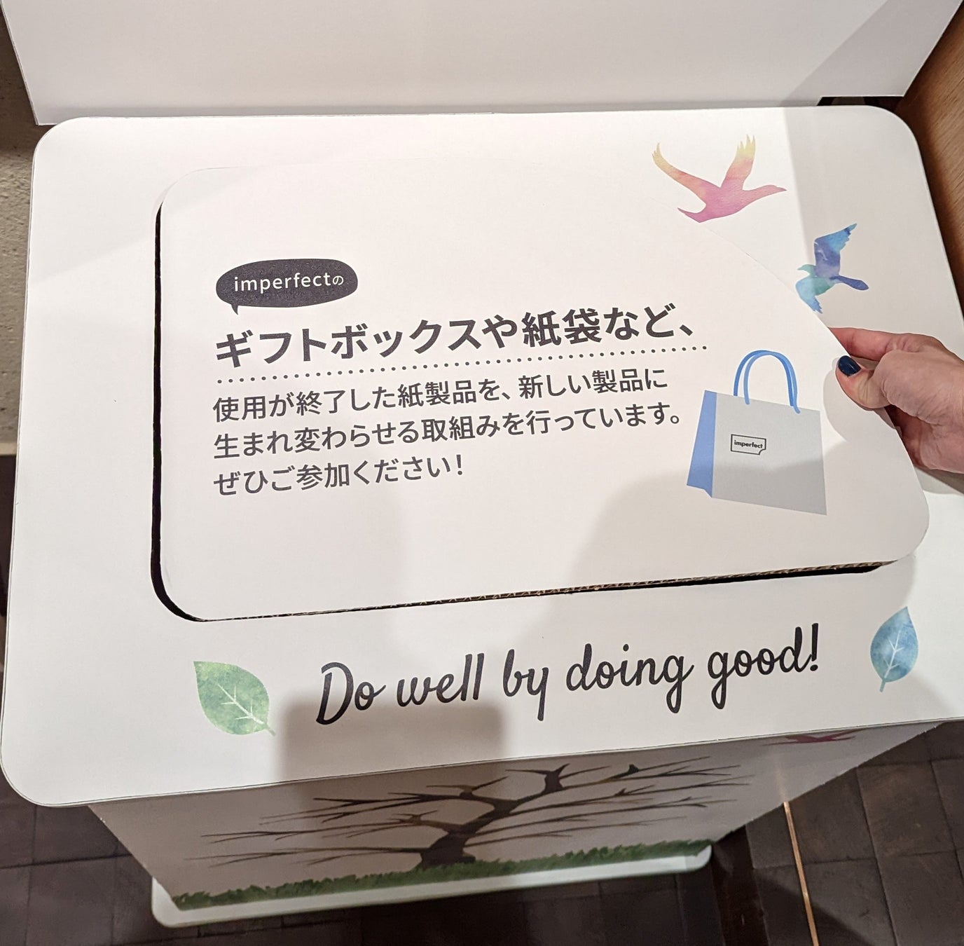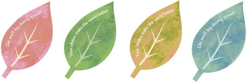 木の枝に回収のご協力いただいたお客さまに、さまざまな色の葉のシールを貼っていただき、葉の生い茂る木を育てます。葉には、imperfectが掲げる「Do well by doing good.」(いいことをして、世界と社会をよくしていこう)と記載されています。
