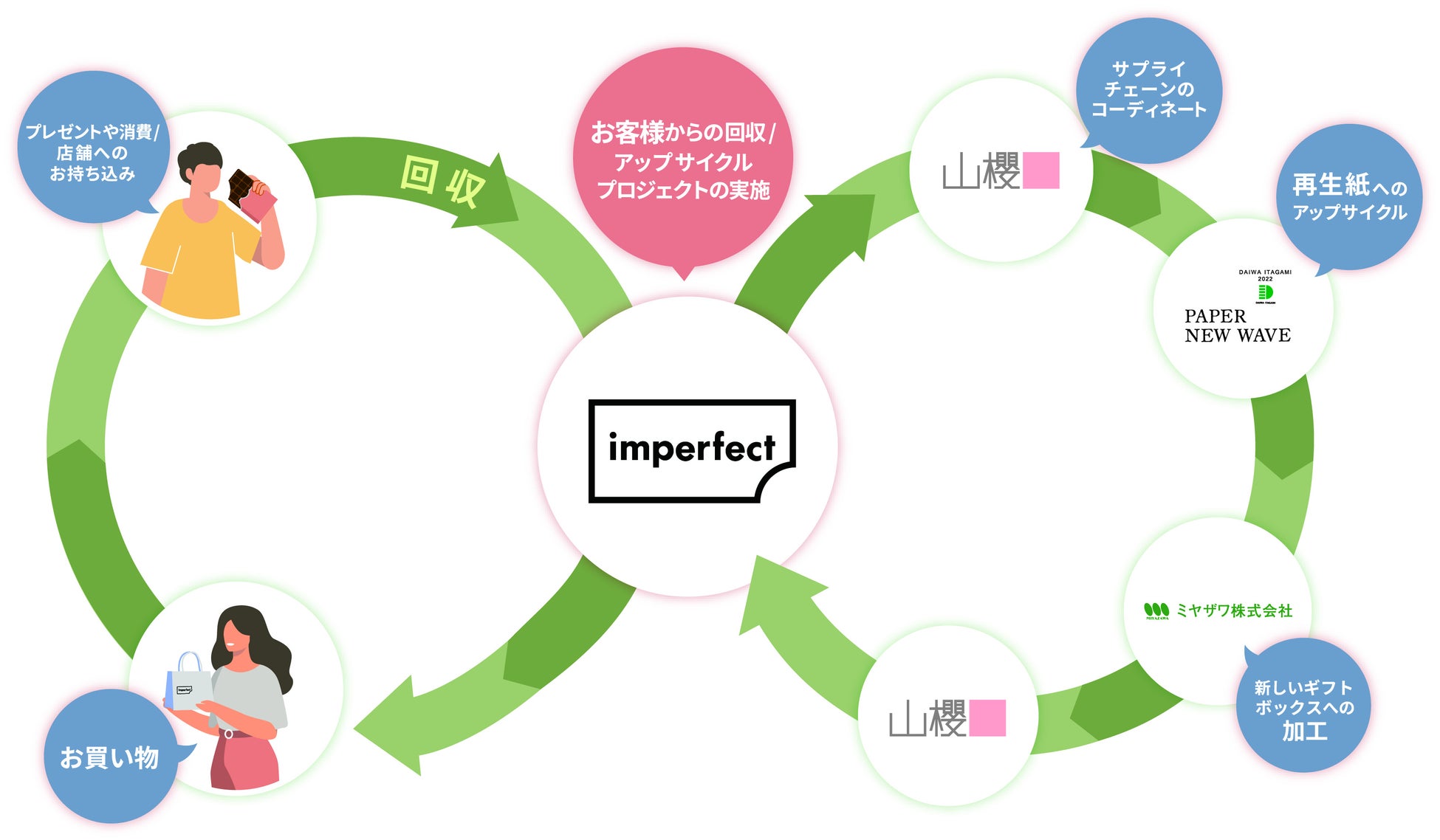 imperfect表参道店舗で使用する紙製品を使用後そのまま廃棄せず、山櫻との協業により、新しいギフトボックスとして生まれ変わる取組みを開始。ご来店いただいたお客さまにも回収にご協力を呼び掛けます。~「あなたの『うれしい』が、次のだれかの『うれしい』に。」~