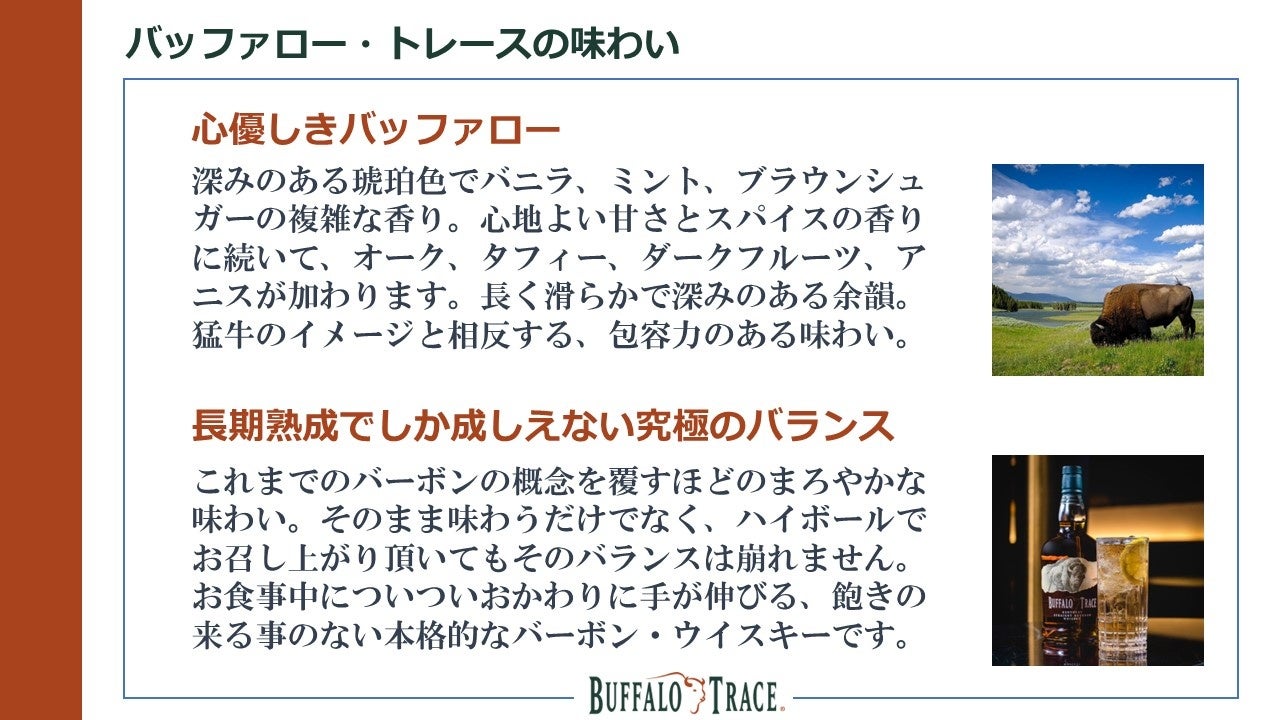 バーボンを愛してやまない生粋のバーボンファンの方、普段はスコッチやコニャックをお楽しみ頂いている方、どちらの方にも究極の一杯をお届けするのが『バッファロー・トレース』です。この機会に是非お楽しみください。