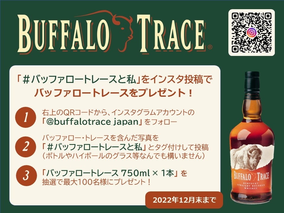 株式会社明治屋(東京都中央区京橋2‐2‐8 代表取締役社長 磯野太市郎)は、6月に総代理店契約を締結した米国サゼラック社が所有するブランド『バッファロー・トレース』(ストレート・バーボン・ウイスキー)を含む画像を【#バッファロートレースと私】とハッシュタグを付けてインスタグラムに投稿していただくと、同商品が抽選で100名様に当たる【#バッファロートレースと私】投稿キャンペーンを2022年10月1日(土)から2022年12月31日(土)まで実施しています。