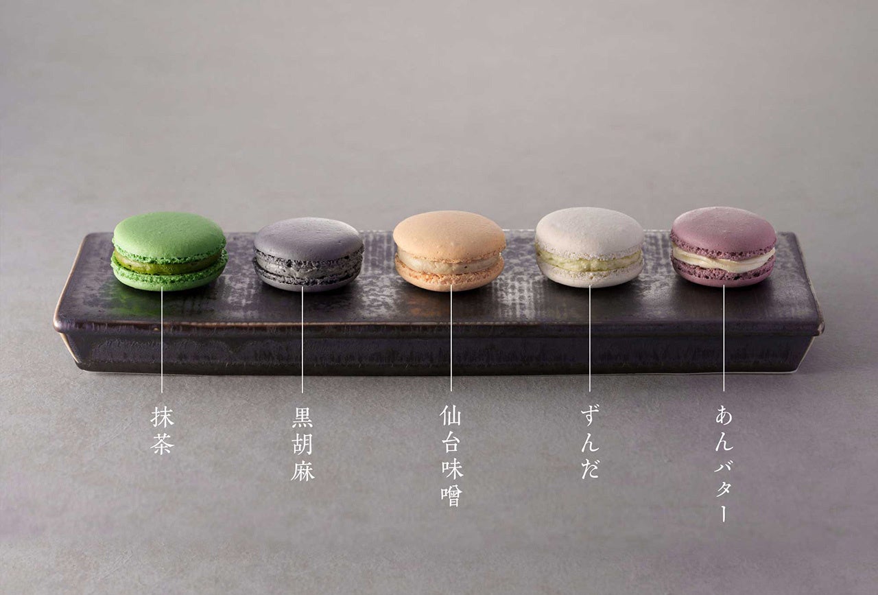 口に入れた瞬間にほどけいく食感が楽しめる和のマカロン。あずき、ずんだ、仙台味噌、黒胡麻、抹茶のクリームを閉じ込めました。