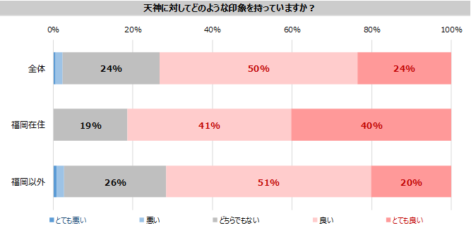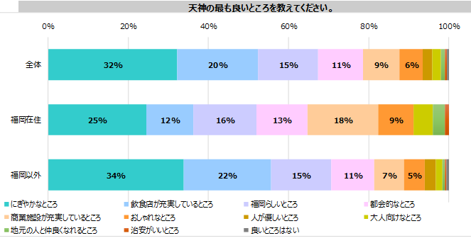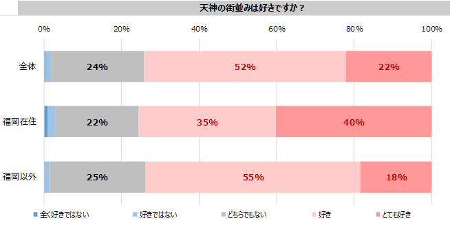1. にぎやかで飲食店が充実している天神に好印象、74%が街並みを好き。