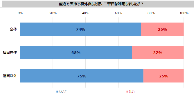二軒目を利用した方は全体で26%、地元の方の利用はわずかに多い32%で、その中の69%がコロナ禍でも利用しています。一方、県民以外の方の二軒目利用は25%、そのうち75%がコロナ前の利用でした。コロナ禍では半数以上の方が福岡に訪れていないと回答していることからも県外からの旅行者は減少しています。