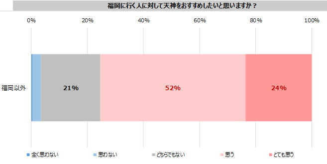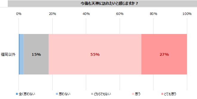 しかし、今後も福岡の天神に訪れたいと感じる方は82%と高く、福岡に行く人に対してもお勧めしたいと76%の方が高い意向を示しています。