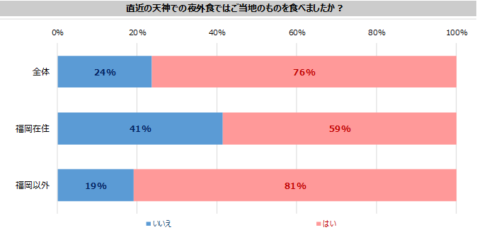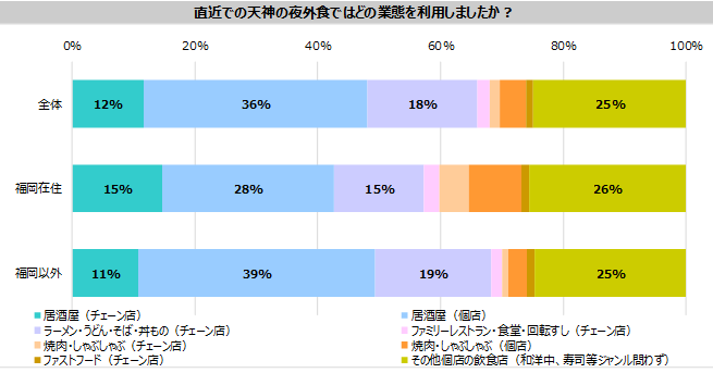 福岡の天神に多くの方が好印象を持っており、街並みが好きだと74%の方が答えています。にぎやかで飲食店が充実しているところが魅力とされています。天神の飲食店を利用したことがある方は全体で85%、夜外食の利用は福岡県在住の方が80%、福岡県以外の方が65%でした。夜外食では個店の居酒屋利用が最も多く、県外から訪れた81%がもつ鍋や博多ラーメン、明太子など福岡の特産品や名物を楽しんだようです。