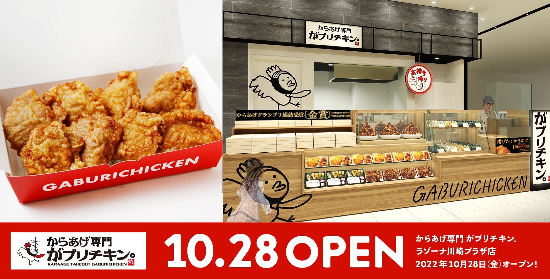 株式会社ブルームダイニングサービス(所在地:名古屋市中村区、代表取締役:杉村明紀)が運営する飲食ブランド「がブリチキン。」は、テイクアウト専門店 神奈川1号店となる、「からあげ専門 がブリチキン。ラゾーナ川崎プラザ店」を、2022年10月28日(金)にグランドオープンいたします。コロナ禍でも「がブリチキン。」のテイクアウトは各店舗ともに好評をいただいており、「がブリチキン。のからあげをお持ち帰り出来るなんて嬉しい」「テイクアウトでも変わらない美味しさ」などと、多くのお声をいただいております。