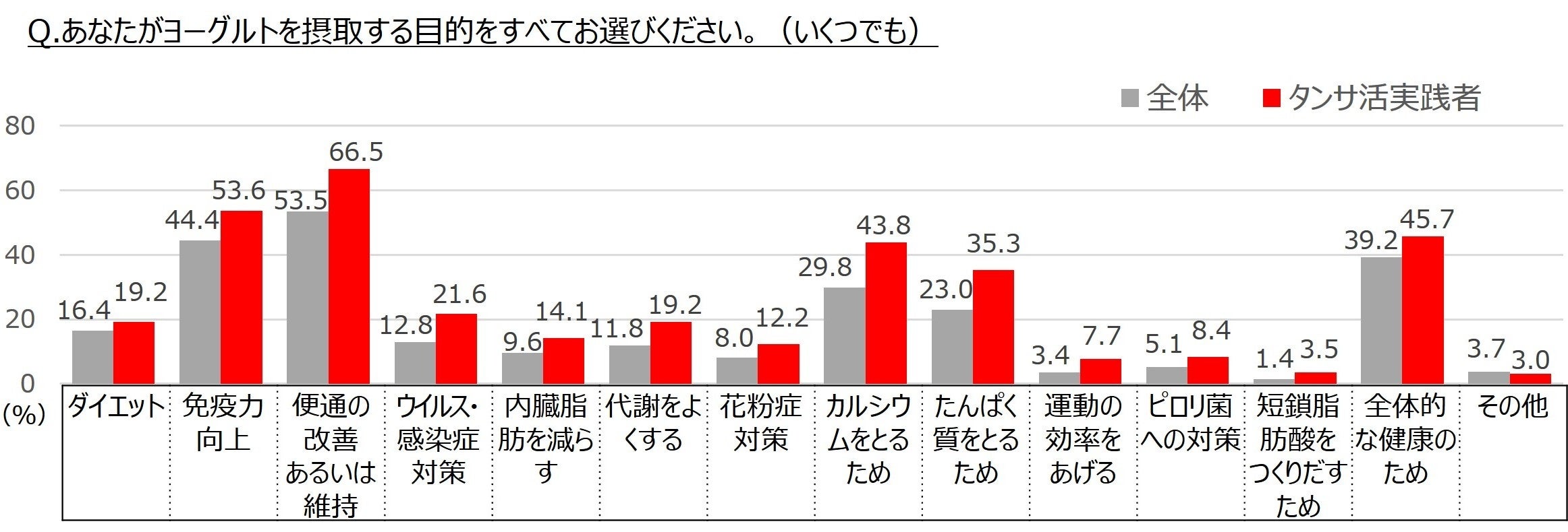ヨーグルトの喫食目的について、1位「便通改善・維持」(53.5%)、2位「免疫力向上」(44.4%)、3