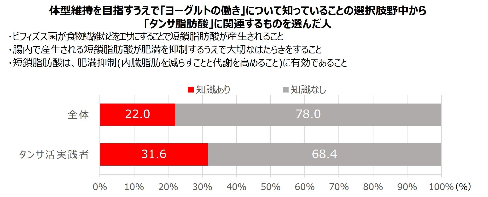 酸が肥満を抑制するうえで大切なはたらきをすること」「短鎖脂肪酸は、肥満抑制(内臓脂肪を減らすことと代謝を高めること)に有効であること」といったタンサ脂肪酸の情報をいずれかひとつでも知っていると回答した人は、全体で22.0%となりました。また「タンサ活」実践者においても31.6%となり、意図せず実践している人が約7割という結果になりました。