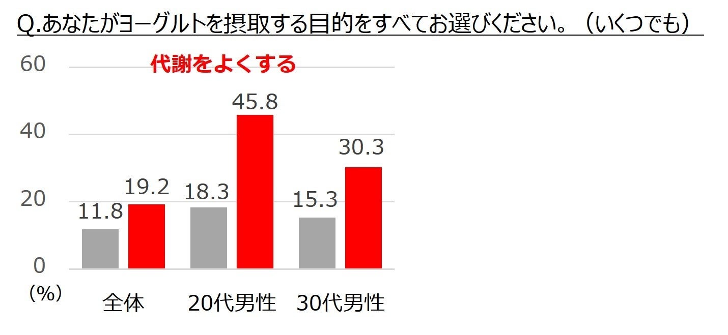 20代・30代男性は、喫食目的が「ダイエット」「内臓脂肪を減らす」「代謝をよくする」が全体より高くなりました。さらに「タンサ活」実践者の20代・30代男性では、この3項目が全体より14.9~34ポイント高い割合となり、またコロナ禍前に比べて「ダイエットのためにヨーグルトを意識して摂取するようになった」は全体より20ポイント以上高くなりました。