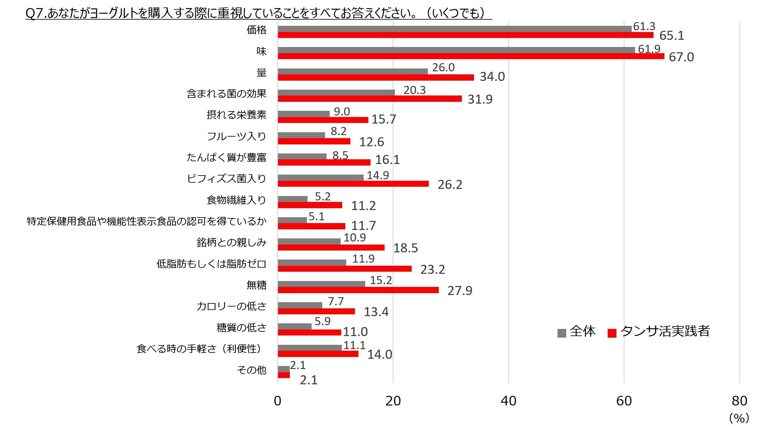 - 6) 「タンサ活」実践者は、ヨーグルト購入時に「菌の効果」「ビフィズス菌入り」「無糖」「低脂肪」を重視