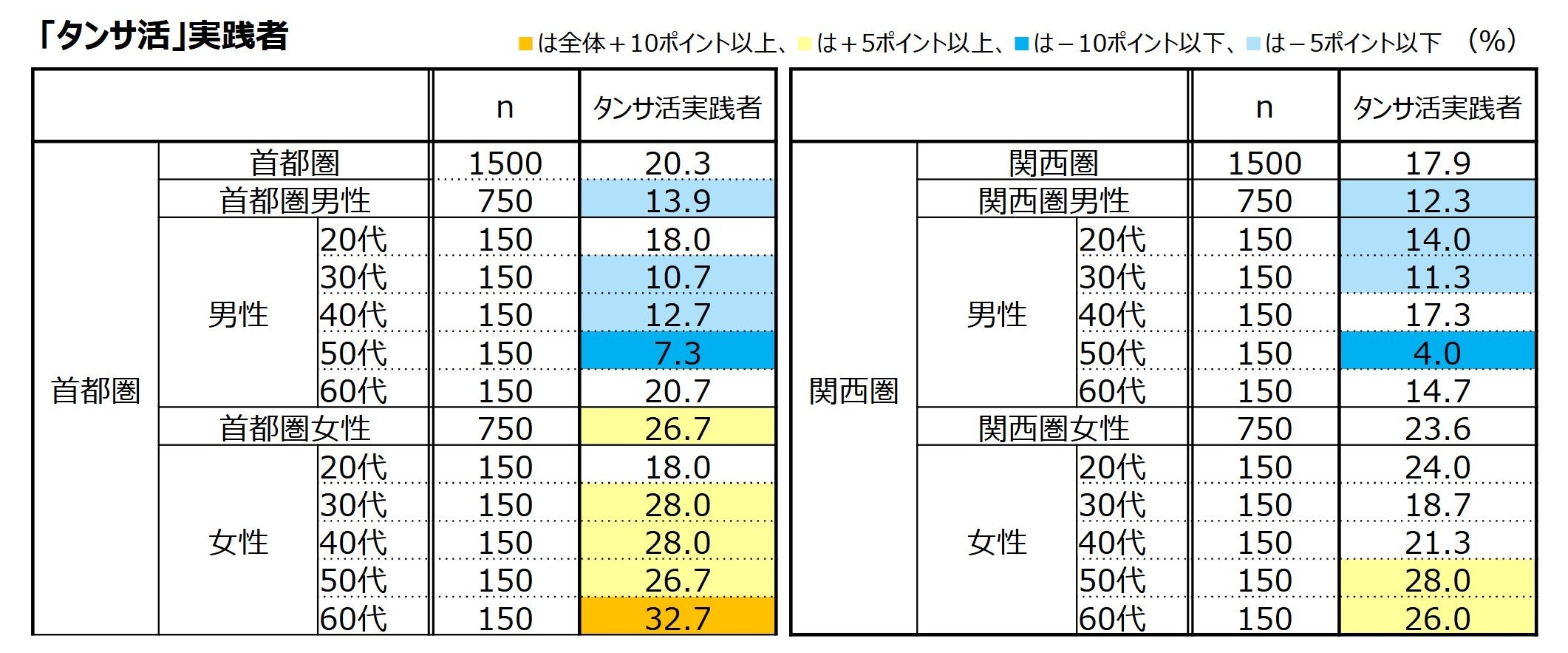 その結果、 「タンサ活」実践者は、日常的にヨーグルトを食べている人の19.1%となりました。また女性では25.1%で4人に1人が「タンサ活」をしていることがわかりました。また首都圏女性60代は32.7%と最も高くなりました。