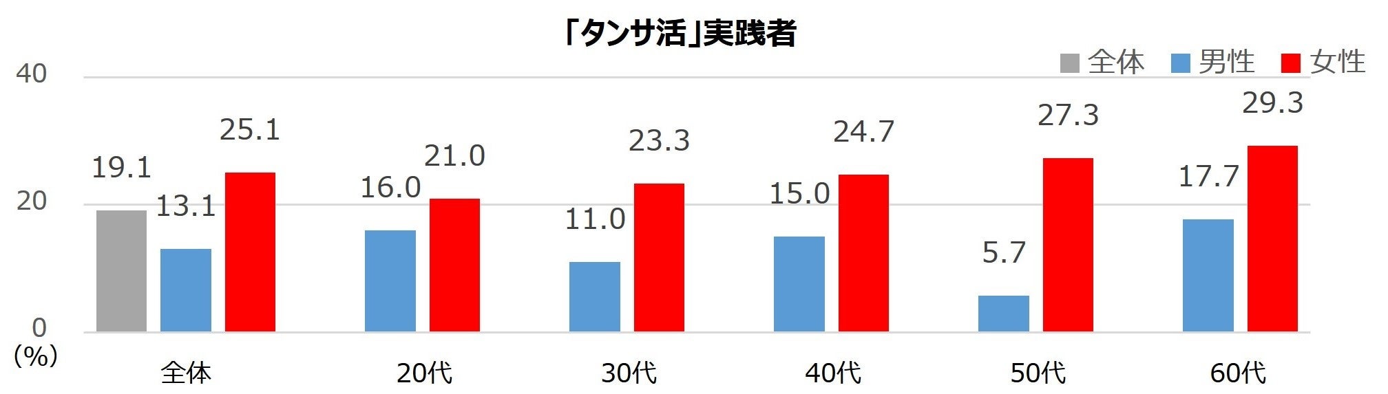 「ビフィズス菌入りヨーグルト」と、ビフィズス菌のエサになってタンサ脂肪酸をつくり出す「水溶性食物繊維」を含む食物を合わせて喫食している人を算出。これを「タンサ活」実践者として調べたところ19.1%(男性13.1%、女性25.1%)でした。日常的にヨーグルトを食べている人の5人に1人、女性では4人に1人が「タンサ活」を実践していました。
