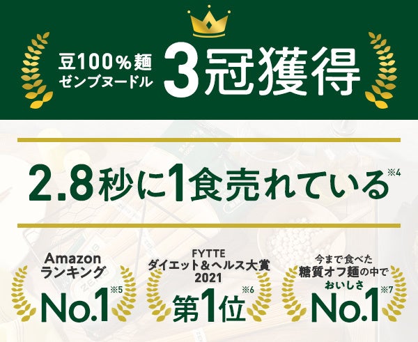 「ZENBヌードル」は、おかげさまで累計販売数700万食を突破し、さらに『Amazon ランキング No.1※5』、『FYTTE ダイエット&ヘルス大賞 No.1※6』、『今まで食べた糖質オフ麺の中でおいしさ No.1※7』の3冠を獲得しました。