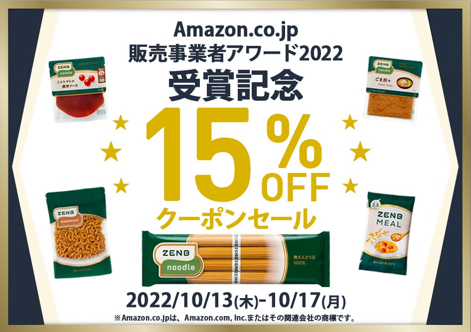 受賞への感謝の気持ちを込めて、2022年10月13日(木)~17日(月)までの5日間限定で、公式「ZENBアマゾン店」の対象商品が15%OFFで購入できるクーポンを配布します※1。また2点以上購入すると5% OFF※2になる特典を使えうことで、さらにおトクにお買い物できます。