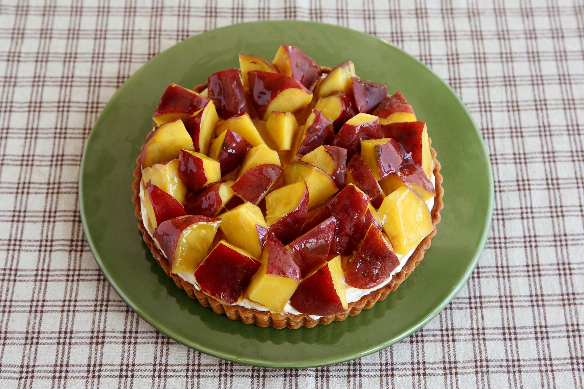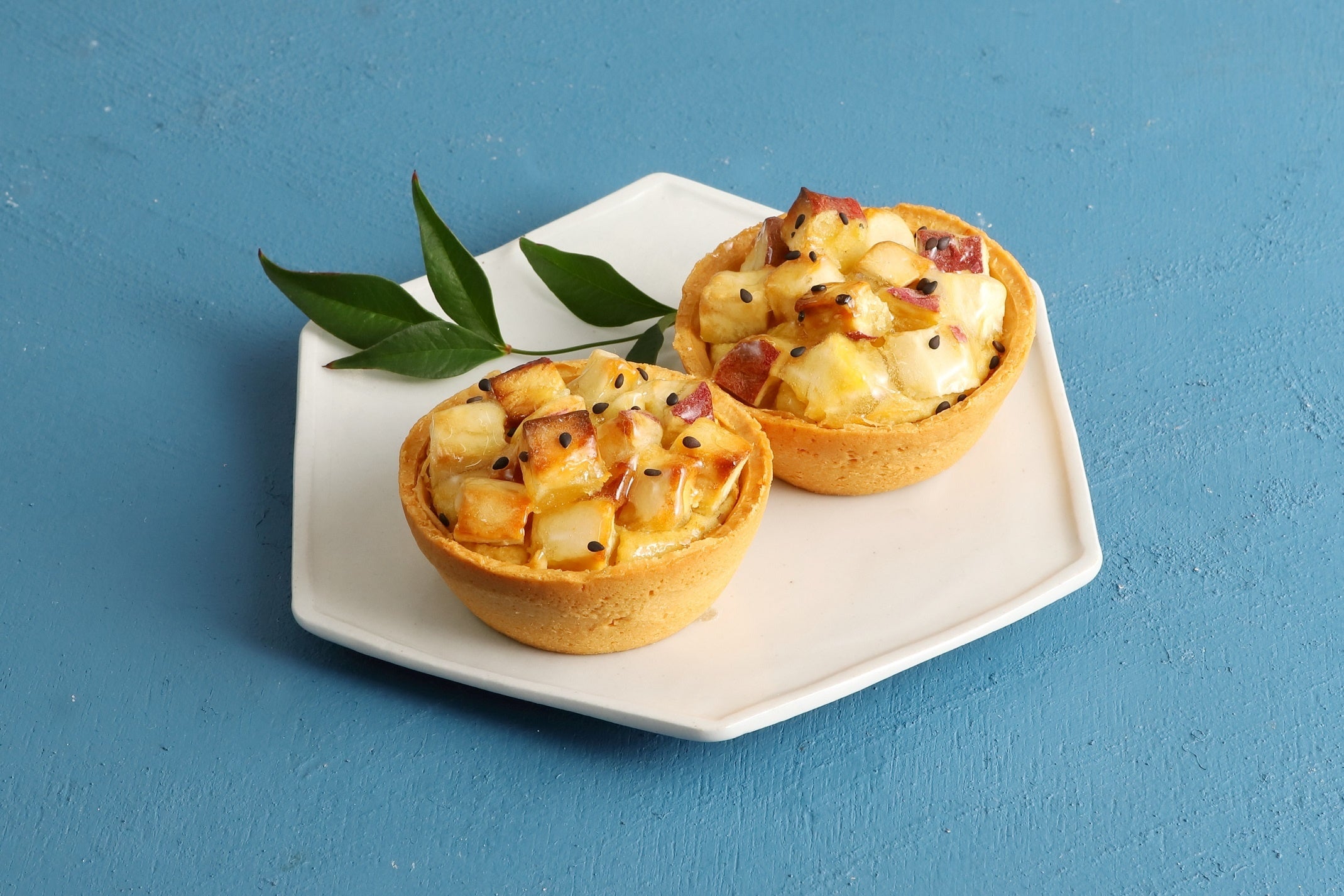 紅はるか・紅あずまを合わせたクリームや芋餡に国産芋のダイスを乗せた、さつまいもたっぷりタルト。