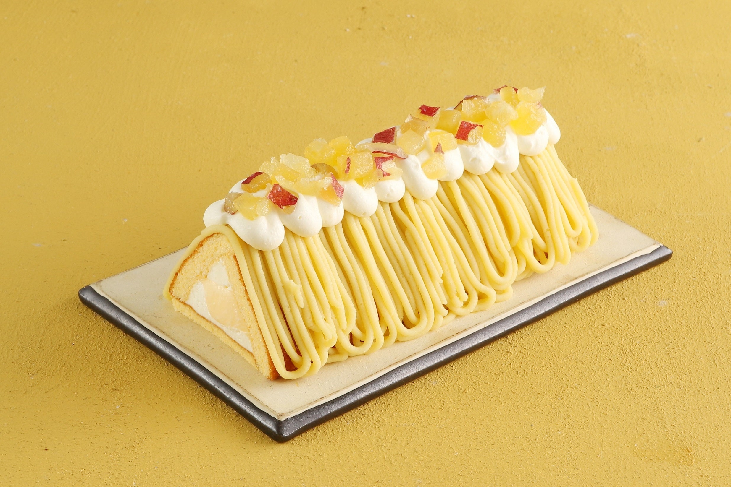 プリンをふんわりスポンジで包み、たっぷりのさつまいもクリームと生クリームをしぼりました。ダイスカットしたトッピングのさつまいものほくほく食感がアクセントに!