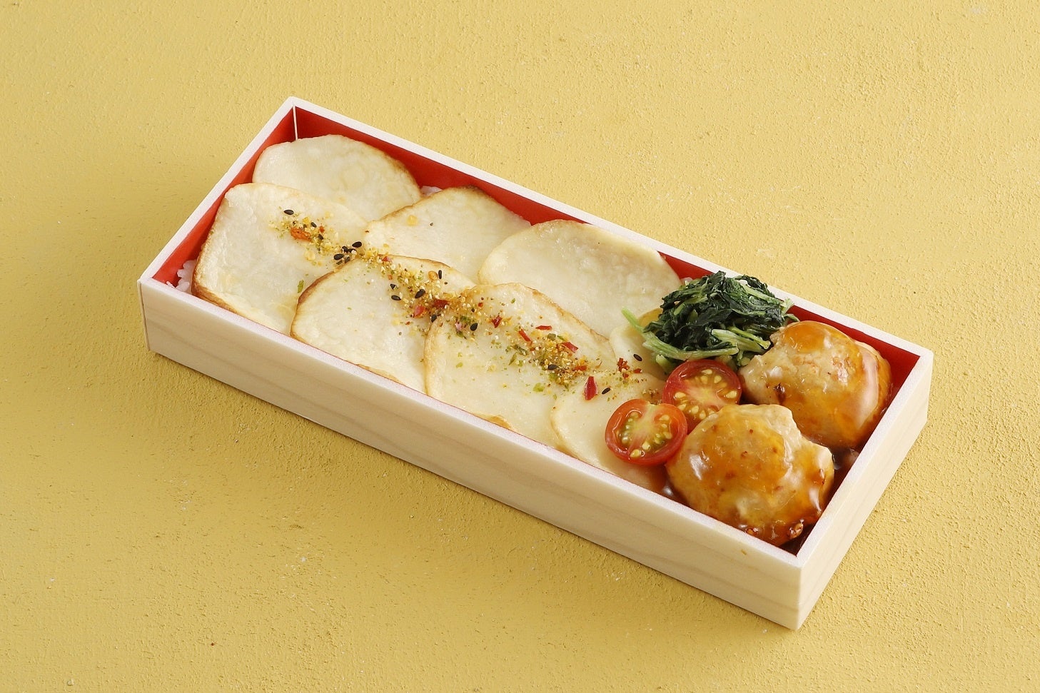 ホクホクのさつまいもと旬のきのこを三元豚で巻いたかつと、きのこごはんが楽しめるお弁当。醤油と大根おろしであっさりとお召し上がりいただけます。