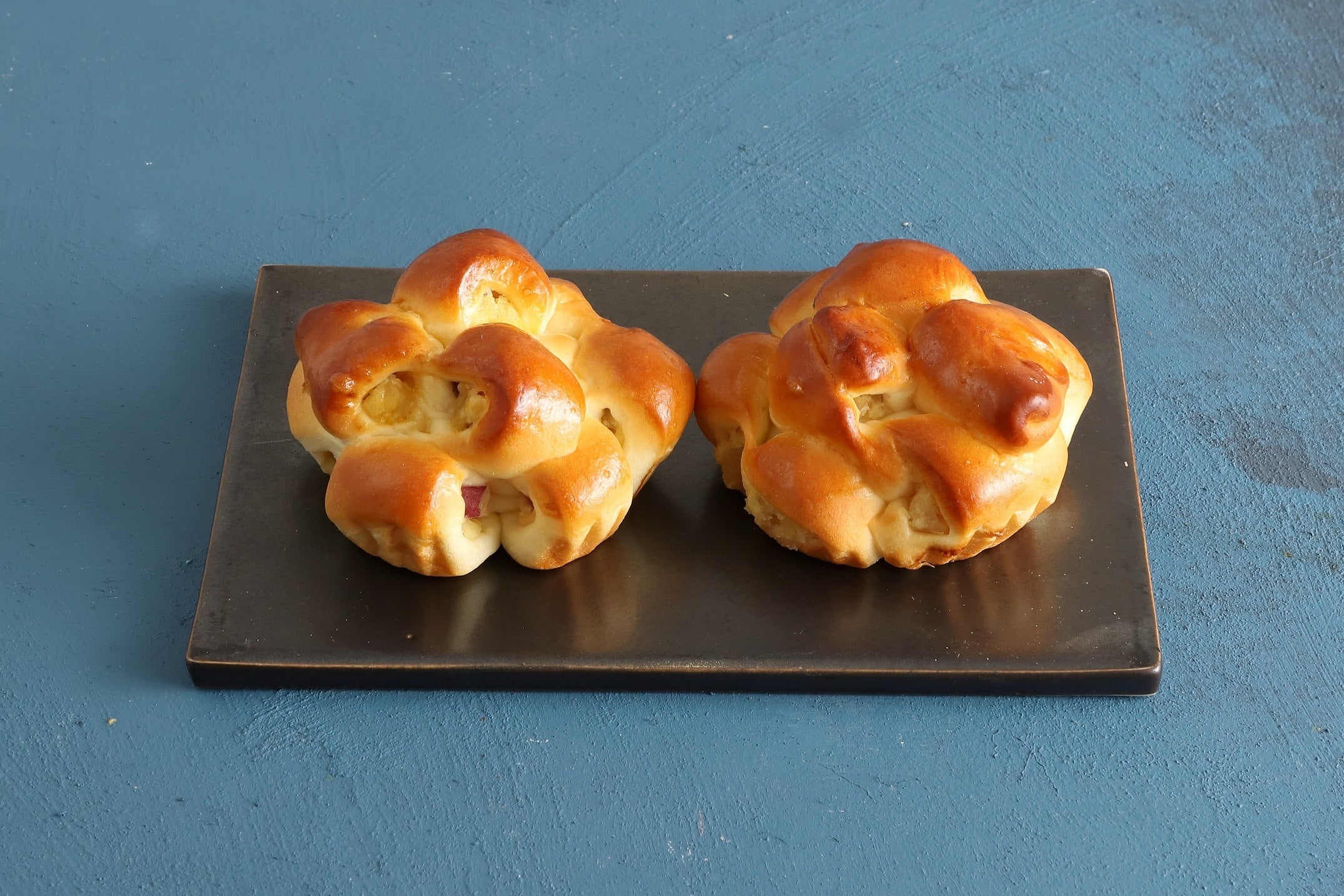 スイートポテトフィリングを包み立体的な形に焼き上げました。ダイスカットのさつまいも(紅はるか)がたっぷり。